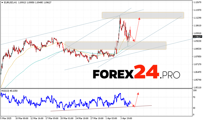 EUR/USD Forecast Euro Dollar for April 8, 2025 suggests an attempt to develop a fall in the pair and a test of the support area near the level of 1.0925. Where should we consider the rebound in the price of the Euro Dollar currency pair upward and an attempt to continue the growth of the asset on the market to the area above the level of 1.1115. An additional signal in favor of the growth of the instrument on the Forex market will be a test of the support line on the relative strength indicator (RSI). The cancellation of the EUR/USD pair growth option will be a drop in quotes and a breakout of the 1.0845 level. This will indicate a breakout of the support area and a continuation of the fall of the currency pair on Forex to the area below the 1.0625 level.