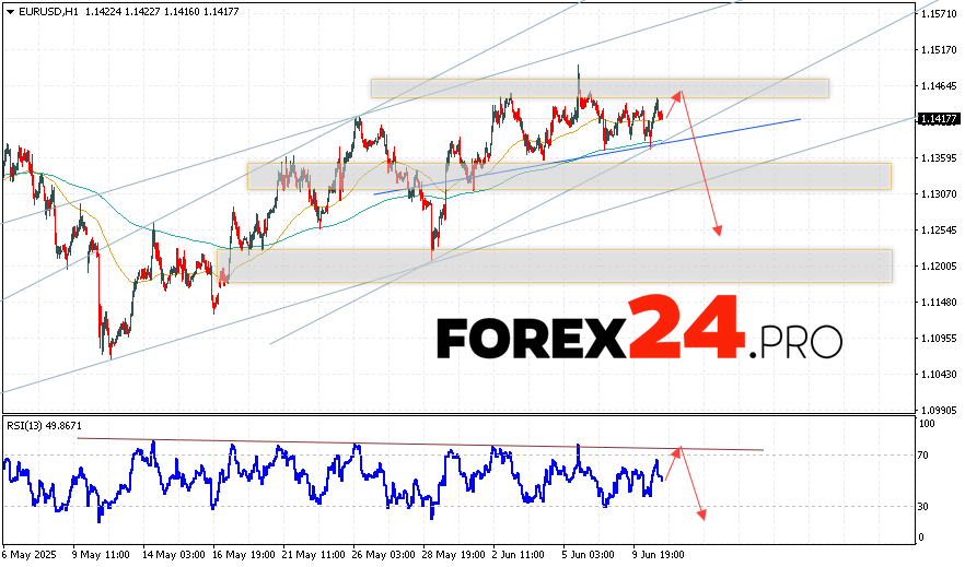 EUR/USD Forecast Euro Dollar for June 11, 2025 suggests an attempt to develop a rise in currency quotes with a test of resistance level near 1.1445. From where we should consider a rebound of quotes downward of the currency pair Euro Dollar and an attempt to continue the decline in the value of the asset on the market to 1.1235. An auxiliary signal in favor of the decline of the instrument at the Forex market will be a rebound from the resistance line on the relative strength indicator (RSI). A strong growth of quotes and a breakdown of 1.1545 will cancel the EUR/USD downside option. This will indicate the breakdown of the resistance zone and the continuation of the currency pair’s rise to 1.1775.