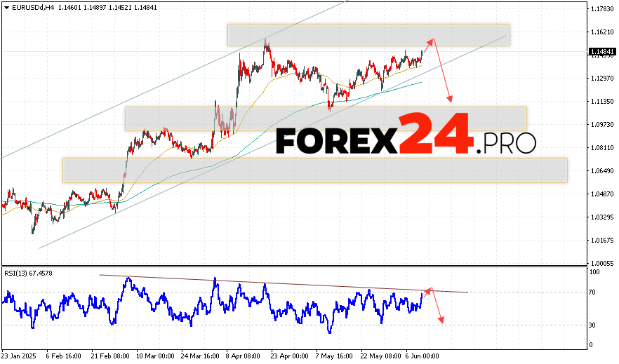 EUR/USD Forecast Euro Dollar for June 12, 2025 suggests an attempt to develop an upward movement in currency quotes with a test of the resistance level near 1.1545. From there, we should see a rebound in the Euro Dollar currency pair and an attempt to continue the decline in the asset’s value on the market to the 1.1145 mark. An auxiliary signal in favor of a decline in the instrument on the Forex market will be a rebound from the resistance line on the relative strength index (RSI). A strong rise in quotes and a breakout of the 1.1675 level will cancel the EUR/USD decline scenario. This will indicate a breakout of the resistance zone and a continuation of the currency pair’s rise on Forex to the 1.1885 mark.