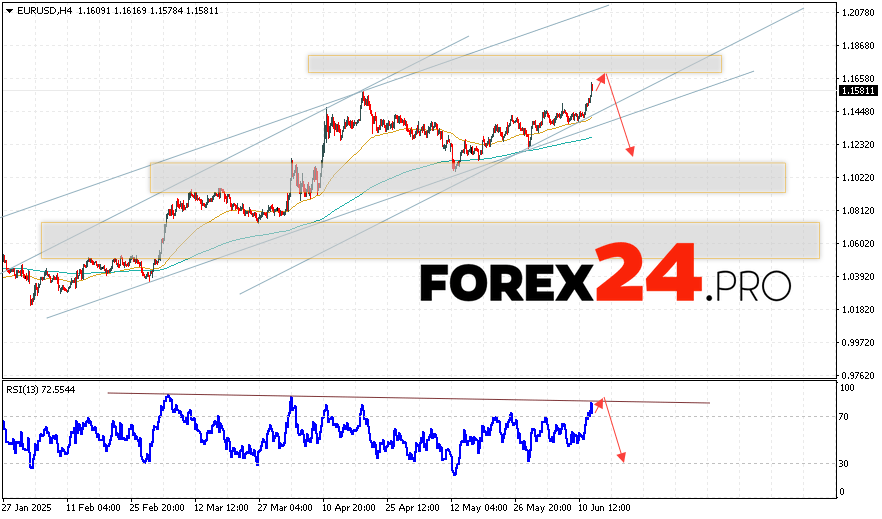EUR/USD Forecast Euro Dollar for June 13, 2025 suggests an attempt to develop an upward movement in currency quotes with a test of the resistance level near 1.1625. From there, we should see a rebound in the Euro Dollar currency pair and an attempt to continue the decline in the asset’s value on the market to the 1.1185 mark. An auxiliary signal in favor of a decline in the instrument on the Forex market will be a rebound from the resistance line on the relative strength index (RSI). A strong rise in quotes and a breakout of the 1.1725 level will cancel the EUR/USD decline scenario. This will indicate a breakout of the resistance zone and a continuation of the currency pair’s rise on Forex to the 1.1945 mark.