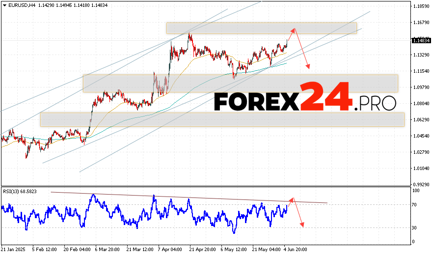 EUR/USD Forecast Euro Dollar for June 6, 2025suggests an attempt to develop an upward movement in currency quotes with a test of the resistance level near 1.1505. From there, we should expect a rebound in the Euro Dollar currency pair and an attempt to continue the decline in the asset’s value on the market to the 1.1145 mark. An auxiliary signal in favor of a decline in the instrument on the Forex market will be a rebound from the resistance line on the relative strength index (RSI). A strong rise in quotes and a breakout of the 1.1685 level will cancel the EUR/USD decline scenario. This will indicate a breakout of the resistance zone and a continuation of the currency pair’s rise on Forex to the 1.1905 mark.