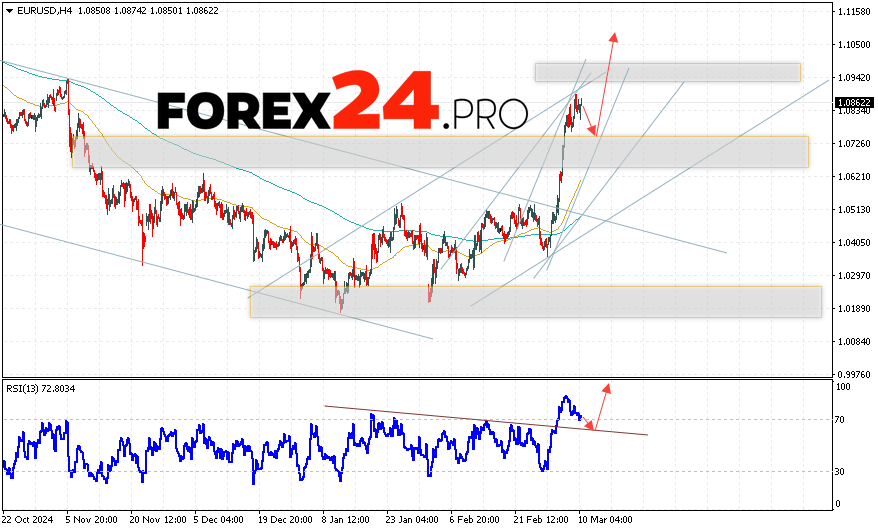EUR/USD Forecast Euro Dollar for March 11, 2025 suggests an attempt to develop a bearish correction of the pair and a test of the support area near the level of 1.0735. Where should we consider the rebound in the price of the Euro Dollar currency pair upward and an attempt to continue the growth of the asset on the market to the area above the level of 1.1065. An additional signal in favor of the instrument’s rise on the Forex market will be a test of the support line on the relative strength indicator (RSI). The cancellation of the growth option for the EUR/USD pair will be a drop in quotes and a breakout of the 1.0665 level. This will indicate a breakout of the support area and a continuation of the decline of the currency pair on Forex to the area below the 1.0525 level.