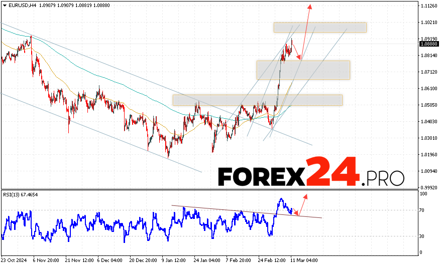 EUR/USD Forecast Euro Dollar for March 12, 2025 suggests an attempt to develop a bearish correction of the pair and a test of the support area near the level of 1.0805. Where should we consider the rebound of the Euro Dollar currency pair upwards and an attempt to continue the growth of the asset on the market to the area above the level of 1.1125. An additional signal in favor of the rise of the instrument on the Forex market will be a test of the support line on the relative strength indicator (RSI). The cancellation of the growth option for the EUR/USD pair will be a drop in quotes and a breakout of the level of 1.0735. This will indicate a breakout of the support area and a continuation of the decline of the currency pair on Forex to the area below the level of 1.0545.