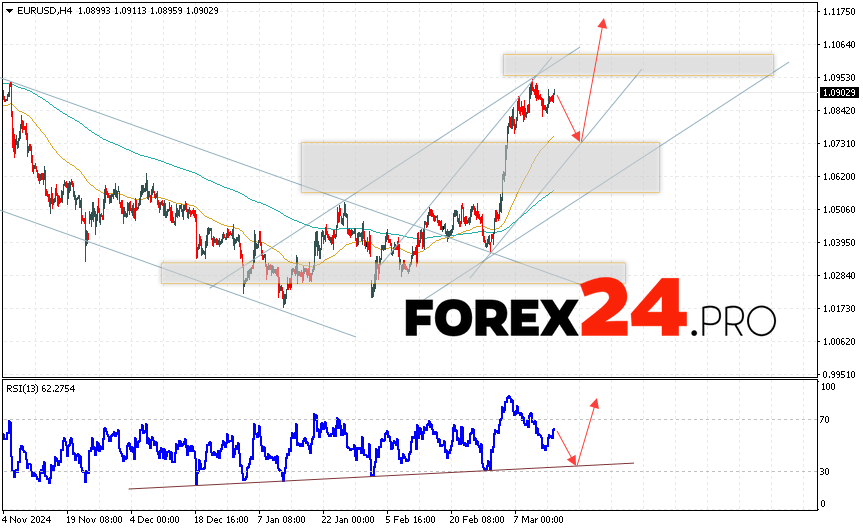 EUR/USD Forecast Euro Dollar for March 18, 2025 suggests an attempt to develop a bearish correction of the pair and a test of the support area near the level of 1.0785. Where should we consider the rebound in the price of the Euro Dollar currency pair upward and an attempt to continue the growth of the asset on the market to the area above the level of 1.1105. An additional signal in favor of the rise of the instrument on the Forex market will be a test of the support line on the relative strength indicator (RSI). The EUR/USD growth scenario will be cancelled if the quotes fall and the 1.0705 level is broken. This will indicate a breakout of the support area and a continuation of the decline of the currency pair on Forex to the area below the 1.0545 level.