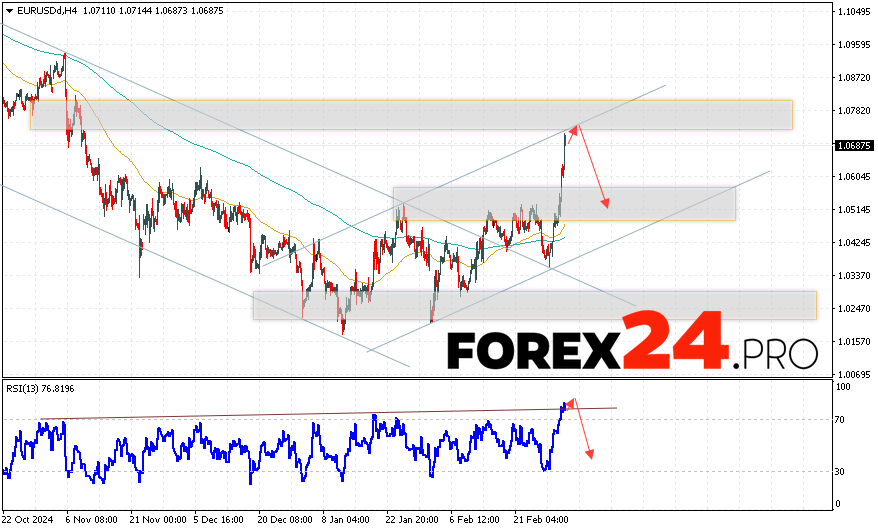 EUR/USD Forecast Euro Dollar for March 6, 2025 suggests an attempt to develop a bullish correction of the pair and a test of the resistance area near the level of 1.0715. From where it is worth considering the rebound in the price of the Euro Dollar currency pair downwards and an attempt to continue the fall of the asset on the market to the area below the level of 1.0525. An additional signal in favor of a decrease in the instrument on the Forex market will be a test of the resistance line on the relative strength indicator (RSI). The cancellation of the option of a decrease in the EUR/USD pair will be a strong increase in quotes and a breakout of the level of 1.0785. This will indicate a breakout of the resistance area and continued growth of the currency pair on Forex to the area above the level of 1.0985.