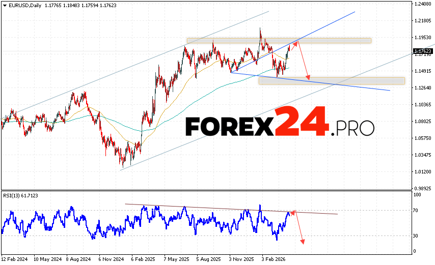 EURUSD Weekly Forecast April 20 – 24, 2026 suggests an attempt at a bullish correction and a test of the resistance area near 1.1825. From this point, a downward price rebound and continued decline in the Forex market below 1.1285 should be expected. An additional signal supporting a decline would be a test of the resistance line on the relative strength indicator (RSI). A strong rally and a breakout of 1.2025 would cancel out the EUR/USD decline. In this case, we should expect continued upside with a potential target at 1.2405.