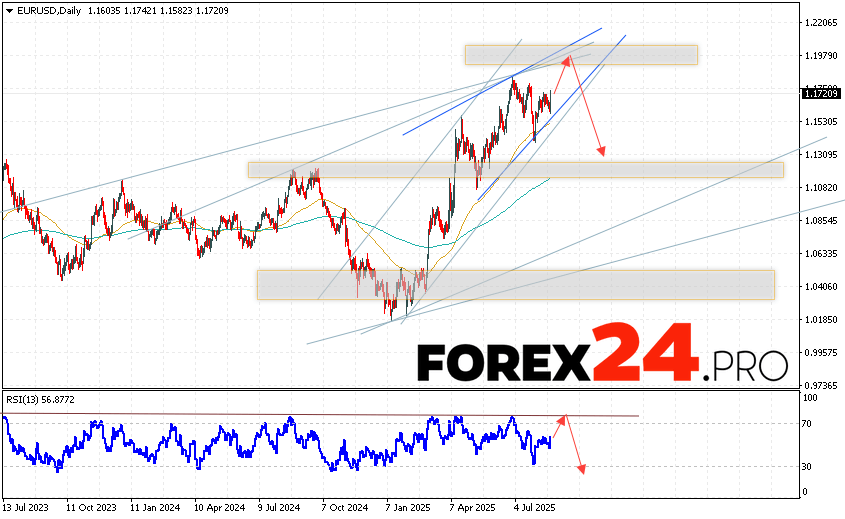 EURUSD Weekly Forecast August 25 — 29, 2025 suggests an attempt to develop a bullish correction and test the resistance area near the level of 1.1945. Where should we expect a price rebound downwards and a continuation of the pair’s fall on the Forex market to the area below the level of 1.1325. An additional signal in favor of a decline will be a test of the resistance line on the relative strength indicator (RSI). The cancellation of the Euro Dollar fall option will be a strong growth and a breakout of the level of 1.2065. In this case, we should expect a continuation of the rise of the pair with a potential target at the level of 1.2345.