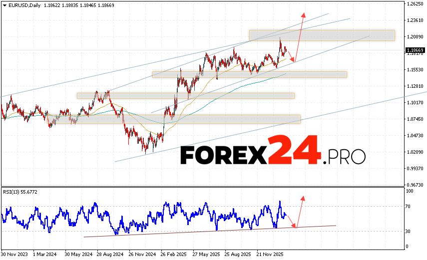 EURUSD Weekly Forecast February 16 – 20, 2026 suggests an attempt at a bearish correction and a test of the support area near 1.1705. From there, we should expect an upward price rebound and continued growth in the Forex market below 1.2375. A test of the support line on the relative strength indicator (RSI) would be an additional signal in favor of an upside move. The Euro/Dollar rally would be cancelled by a decline and a breakout of 1.1505. In this case, we should expect continued decline in the pair, with a potential target at 1.1165.