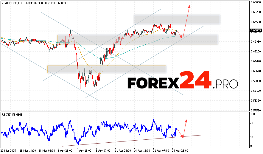 Australian Dollar Forecast for April 25, 2025 suggests an attempt to test the support level near the area of 0.6305. Further, the continuation of the growth of the pair’s quotes above the level of 0.6545. An additional signal in favor of the growth of the pair will be a test of the trend line on the relative strength indicator. The scenario with the rise will be cancelled if the AUD/USD quotes fall and the area of 0.6225 is broken. This will indicate a continuation of the decline in quotes with a potential target below the level of 0.6045.