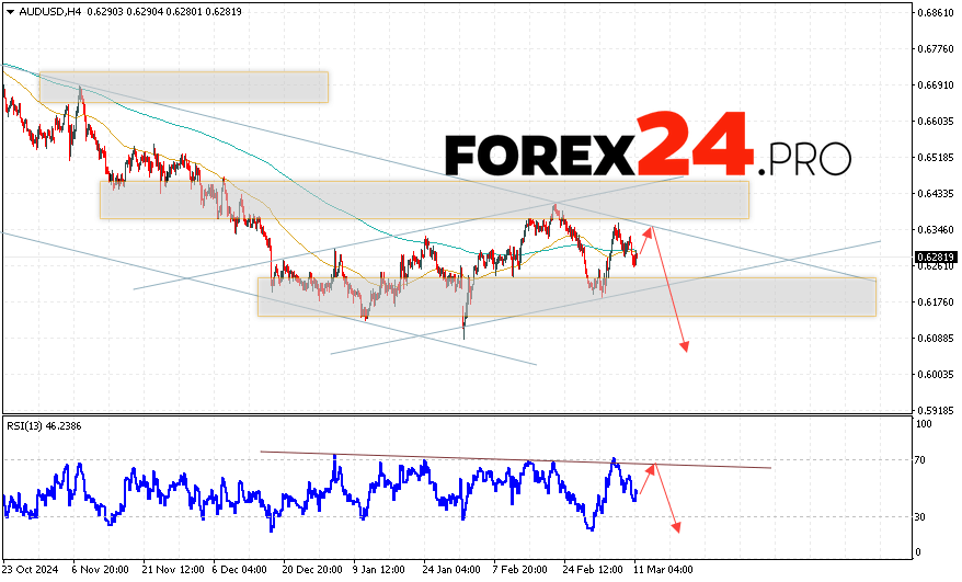 Australian Dollar Forecast for March 12, 2025 suggests an attempt to test the resistance level near the 0.6345 area. Further, the pair’s quotes will continue to fall below the 0.6075 level. An additional signal in favor of the pair’s decline will be a test of the trend line on the relative strength indicator. The scenario with a fall will be cancelled by a strong growth in the AUD/USD quotes and a breakout of the 0.6435 area. This will indicate a continuation of the rise in quotes with a potential target above the level of 0.6615.
