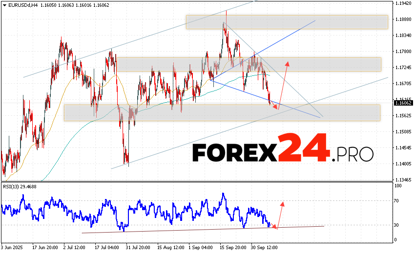 The Euro Dollar EUR/USD currency pair continues to move downwards and form a “Wedge” reversal pattern. Moving averages indicate a short-term bullish trend for the pair. Prices have broken below the signal lines, indicating downward pressure from sellers of the European currency and a potential further decline in the currency pair from current levels. At the time of publication of this forecast, the Euro to Dollar exchange rate is currently 1.160. The Forex forecast for October 9, 2025, anticipates an attempt to continue the decline and a test of the support level located near 1.1575 for the EUR/USD pair. This should then lead to an upward rebound and the beginning of a bullish momentum in the Euro Dollar currency pair. A potential target for such a move on Forex is above 1.1725.