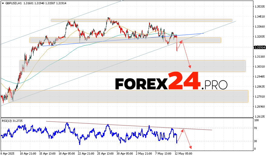 GBPUSD Forecast and Analysis for May 13, 2025 suggests an attempt to develop growth and test the resistance area near the level of 1.3235. Then, the continuation of the fall with the target near the level of 1.3025. An additional signal in favor of the British Pound decline will be a test of the resistance line on the relative strength indicator (RSI). A strong growth of the British Pound against the U.S. Dollar and a breakdown of the 1.3405 area will cancel the downside option. This will indicate the continuation of growth on Forex pair with a potential target above the level of 1.3675.