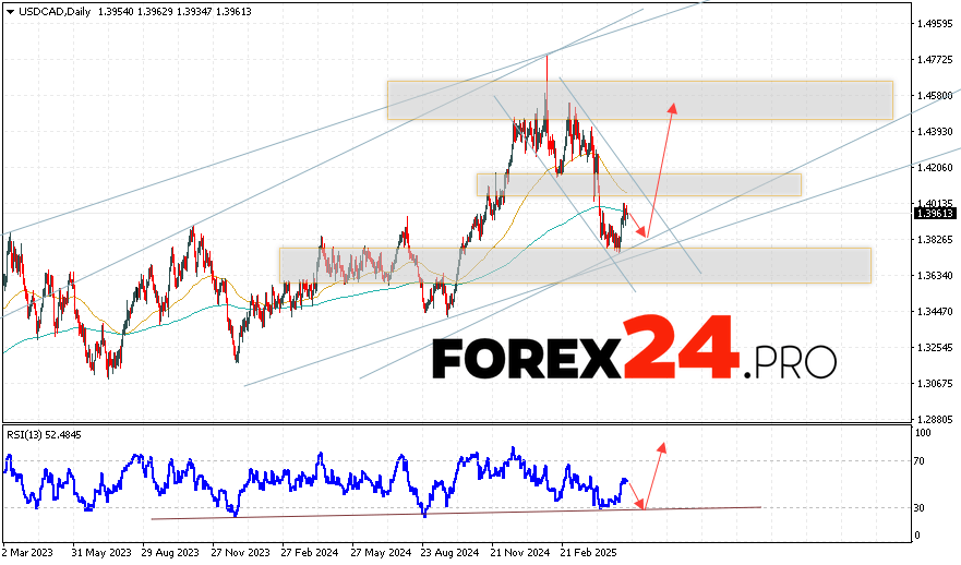 USDCAD Weekly Forecast May 19 — 23, 2025 anticipates a development of bearish correction and testing the support area near level 1.3825. Subsequently, continuation of growth with a target above level 1.4435. An additional bullish signal would be a test of the trend line on the Relative Strength Index (RSI) indicator. Rejection of the upward movement variant will be a drop and a break through the area of 1.3605, indicating a breach of an important support level and continuation of the decline with a target below 1.3325.