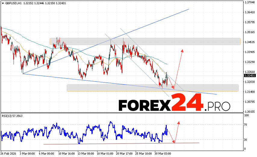 GBP/USD Forecast and Analysis for April 1, 2026 suggests an attempt to develop a bearish correction and test the support area near 1.3155. Then, continued growth with a target near 1.3395. An additional signal in favor of an uptrend for the British Pound will be a test of the support line on the relative strength indicator (RSI). A decline in the British Pound against the US Dollar and a breakout of 1.3005 would cancel out the uptrend. This would indicate a continued decline in the Forex pair with a potential target below 1.2765.