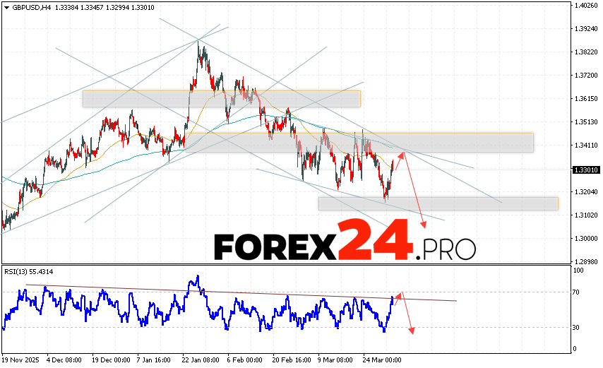 GBP/USD Forecast and Analysis for April 2, 2026 suggests an attempt to develop a bullish correction and test the resistance area near 1.3365. Then, a continued decline in quotes with a target near 1.3065. An additional signal favoring a decline in the British Pound will be a test of the resistance line on the relative strength indicator (RSI). A strong rise in the British Pound against the US Dollar and a breakout of 1.3455 would cancel the downward scenario. This would indicate a continued rise in the Forex pair with a potential target above 1.3845.