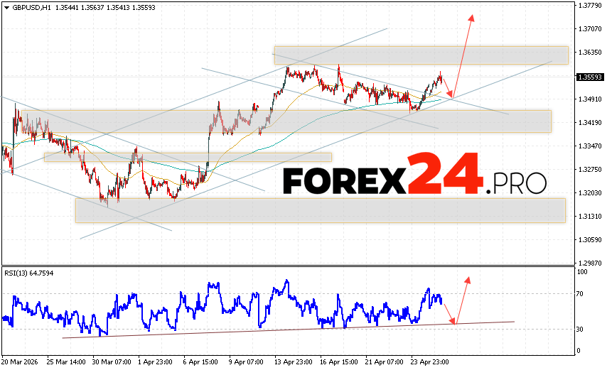 GBP/USD Forecast and Analysis for April 28, 2026 suggests an attempt to develop a bearish correction and test the support area near 1.3495. Then, continued growth with a target near 1.3745. An additional signal favoring a rise in the British Pound will be a test of the support line on the relative strength indicator (RSI). A decline in the British Pound against the US Dollar and a breakout of 1.3405 would invalidate this upward trend. This would indicate a continued decline in the Forex pair with a potential target below 1.3285.