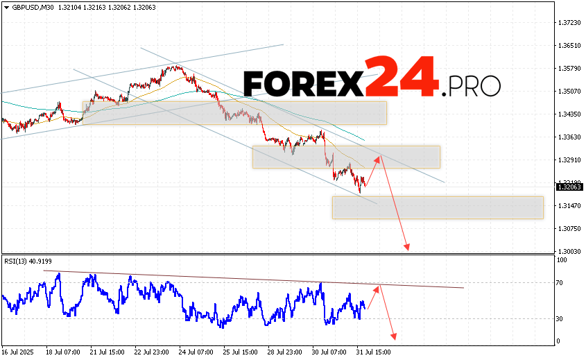 GBP/USD Forecast and Analysis for August 1, 2025 suggests an attempt to develop growth and test the resistance area near the 1.3275 level. Then, the quotes will continue to fall with a target near the 1.3005 level. An additional signal in favor of a decline in the British pound will be a test of the resistance line on the relative strength index (RSI). A strong rise in the British pound against the US dollar and a breakout of the 1.3405 area will cancel the decline scenario. This will indicate a continuation of the rise in the Forex pair with a potential target above the 1.3665 level.
