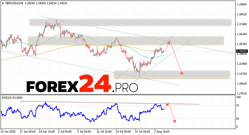 GBP/USD Forecast and Analysis for August 13, 2025 suggests an attempt to develop growth and test the resistance area near 1.3515. Then, a continuation of the fall in quotes with a target near 1.3175. An additional signal in favor of a decline in the British Pound will be a test of the resistance line on the relative strength indicator (RSI). The cancellation of the fall option will be a strong growth of the British Pound against the US Dollar and a breakout of the 1.3565 area. This will indicate a continuation of the rise on Forex pair with a potential target above 1.3775.