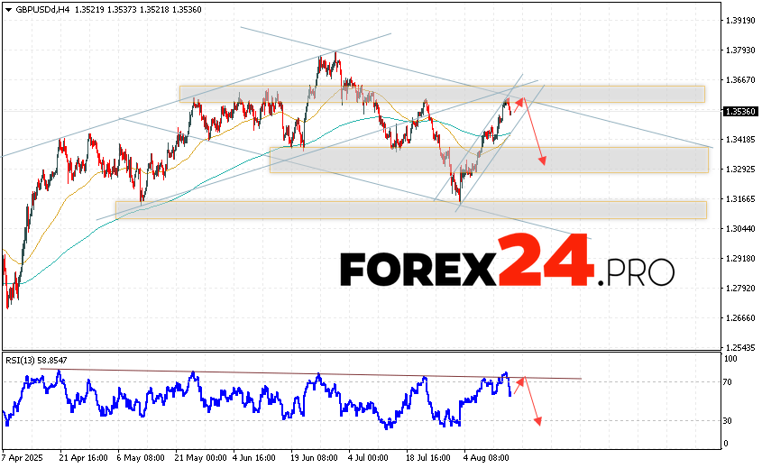 GBP/USD Forecast and Analysis for August 15, 2025 suggests an attempt to develop growth and test the resistance area near the 1.3565 level. Then, the quotes will continue to fall with a target near the 1.3295 level. An additional signal in favor of a decline in the British pound will be a test of the resistance line on the relative strength index (RSI). A strong rise in the British pound against the US dollar and a breakout of the 1.3675 area will cancel the decline scenario. This will indicate a continuation of the rise in the Forex pair with a potential target above the 1.3885 level.