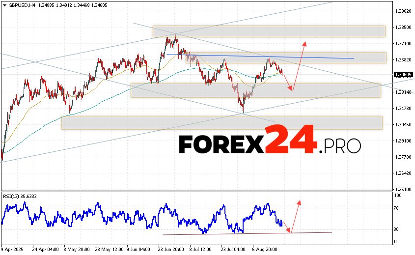 GBPUSD Forecast and Analysis for August 21, 2025 suggests an attempt to develop growth and test the support area near the level of 1.3325. Then, continuation of quotes growth with a target near the level of 1.3725. An additional signal in favor of the rise of the British Pound will be a test of the support line on the relative strength indicator (RSI). The cancellation of the growth option will be the fall of the British Pound against the US Dollar and a breakout of the 1.3135 area. This will indicate a continuation of the decline on the Forex pair with a potential target below the level of 1.2945.