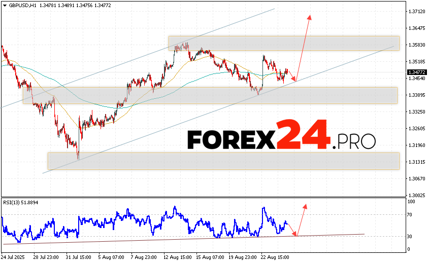 GBP/USD Forecast and Analysis for August 27, 2025 suggests an attempt to develop growth and test the support area near 1.3455. Then, continued growth of quotes with a target near 1.3675. An additional signal in favor of the rise of the British Pound will be a test of the support line on the relative strength indicator (RSI). The cancellation of the growth option will be the fall of the British Pound against the US Dollar and a breakout of the 1.3345 area. This will indicate a continuation of the decline on Forex of the pair with a potential target below 1.3165.