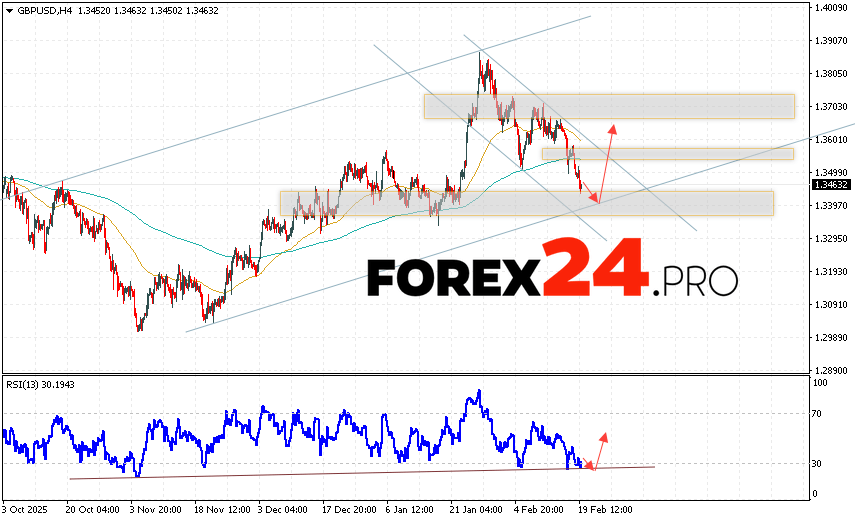 GBP/USD Forecast and Analysis for February 20, 2026 suggests an attempt to develop a bearish correction and test the support area near 1.3405. Subsequently, continued growth with a target near 1.3645. An additional signal in favor of an uptrend for the British Pound will be a test of the support line on the relative strength indicator (RSI). A decline in the British Pound against the US Dollar and a breakout of 1.3345 would cancel out the uptrend. This would indicate a continued decline in the Forex pair with a potential target below 1.3165.