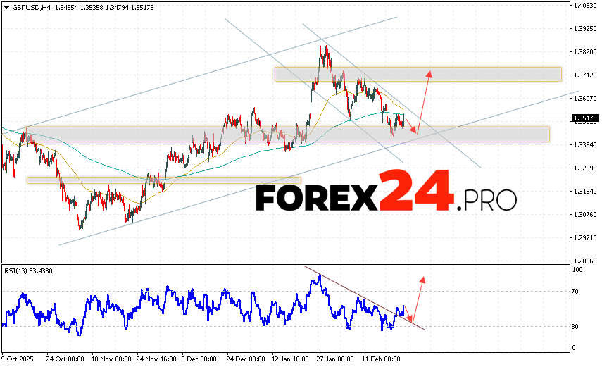GBP/USD Forecast and Analysis for February 25, 2026 suggests an attempt at a bearish correction and a test of the support area near 1.3415. Subsequently, quotes will continue to rise with a target near 1.3725. An additional signal favoring a rise in the British Pound will be a test of the support line on the relative strength indicator (RSI). A decline in the British Pound against the US Dollar and a break of 1.3365 will cancel out this upside scenario. This will indicate a continued decline in the Forex pair with a potential target below 1.3185.