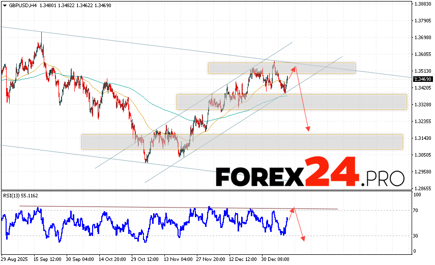 GBP/USD Forecast and Analysis for January 13, 2026 suggests an attempt to continue the rally and test the resistance area near 1.3515. Then, a continuation of the decline in quotes with a target near 1.3135. An additional signal favoring a decline in the British Pound will be a test of the resistance line on the relative strength indicator (RSI). A strong rise in the British Pound against the US Dollar and a breakout of 1.3645 would cancel the downward trend. This will indicate a continued rise in the Forex pair with a potential target above the level of 1.3875.