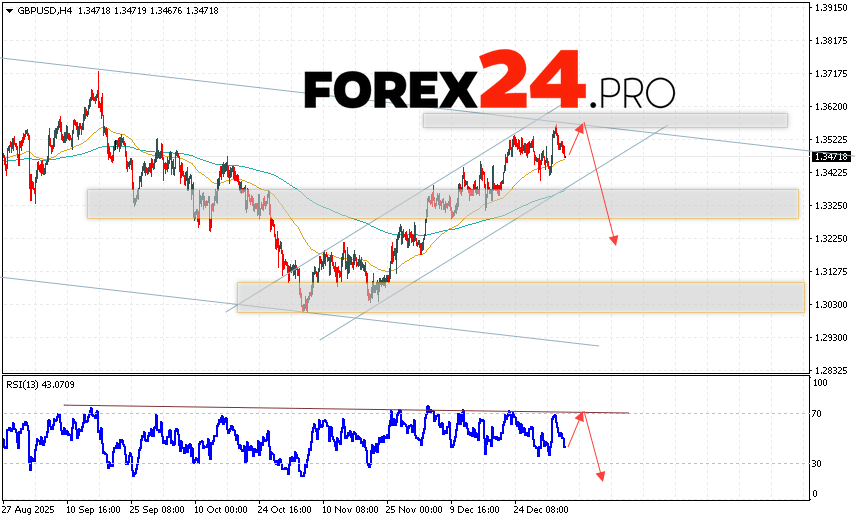 GBP/USD Forecast and Analysis for January 8, 2026 suggests an attempt to continue the rise and test the resistance area near 1.3535. Then, a continuation of the decline in quotes with a target near 1.3215. An additional signal for a decline in the British Pound will be a test of the resistance line on the relative strength indicator (RSI). A strong rise in the British Pound against the US Dollar and a breakout of 1.3645 would cancel the downward trend. This would indicate a continued rise in the Forex pair with a potential target above 1.3865.