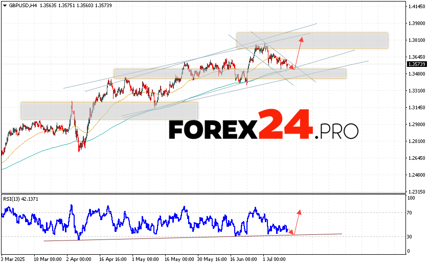 GBP/USD Forecast and Analysis for July 11, 2025 suggests an attempt to develop a decline and test the support area near the 1.3545 level. Then, the quotes will continue to grow with a target near the 1.3825 level. An additional signal in favor of the British pound’s rise will be a test of the support line on the relative strength index (RSI). The rise option will be canceled if the British pound falls against the US dollar and breaks through the 1.3455 area. This will indicate a continuation of the decline in the Forex pair with a potential target below the 1.3245 level.