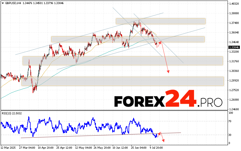 GBP/USD Forecast and Analysis for July 16, 2025 suggests an attempt to develop growth and test the resistance area near the 1.3465 level. Then, the quotes will continue to fall with a target near the 1.3035 level. An additional signal in favor of a decline in the British pound will be a test of the resistance line on the relative strength index (RSI). A strong rise in the British pound against the US dollar and a breakout of the 1.3575 area will cancel the decline scenario. This will indicate a continuation of the rise in the Forex pair with a potential target above the 1.3705 level.