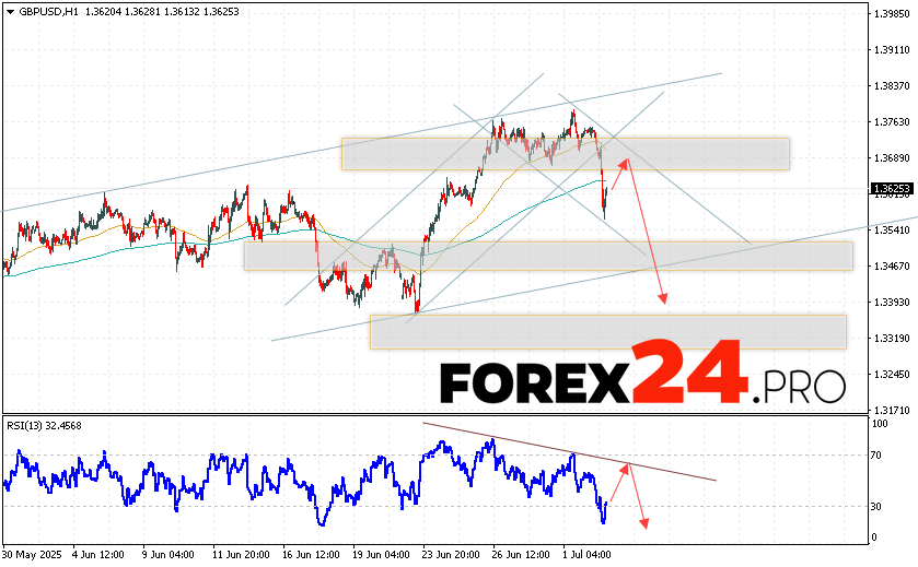 GBP/USD Forecast and Analysis for July 3, 2025 suggests an attempt to develop growth and test the resistance area near the 1.3685 level. Then, the quotes will continue to fall with a target near the 1.3385 level. An additional signal in favor of a decline in the British pound will be a test of the resistance line on the relative strength index (RSI). A strong rise in the British pound against the US dollar and a breakout of the 1.3855 area will cancel the decline scenario. This will indicate a continuation of the rise in the Forex pair with a potential target above the 1.4145 level.