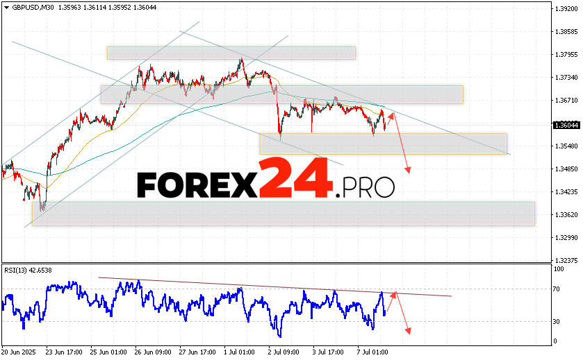 GBP/USD Forecast and Analysis for July 8, 2025suggests an attempt to develop a decline and test the resistance area near the level of 1.3655. Then, the continuation of the quotes decline with the target near the level of 1.3485. An additional signal in favor of the British Pound decline will be a test of the resistance line on the relative strength indicator (RSI). A strong growth of the British Pound against the U.S. Dollar and a breakdown of the 1.3705 area will cancel the downside option. This will indicate the continuation of the pair’s rise on Forex with a potential target above the level of 1.3945.