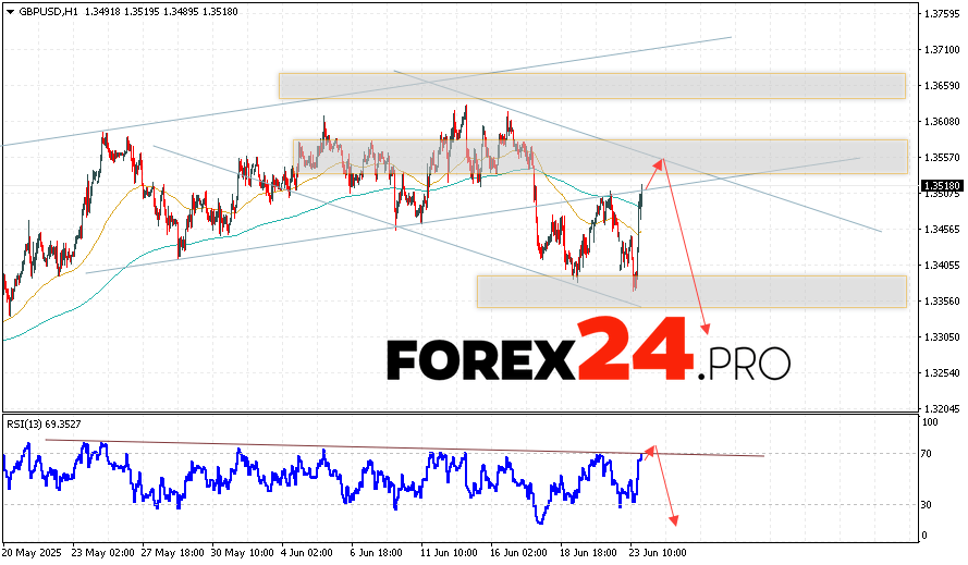 GBP/USD Forecast and Analysis for June 24, 2025 suggests an attempt to develop growth and test the resistance area near the 1.3555 level. Then, the quotes will continue to fall with a target near the 1.3315 level. An additional signal in favor of a decline in the British pound will be a test of the resistance line on the relative strength index (RSI). A strong rise in the British pound against the US dollar and a breakout of the 1.3645 area will cancel the decline scenario. This will indicate a continuation of the rise in the Forex pair with a potential target above the 1.3875 level.