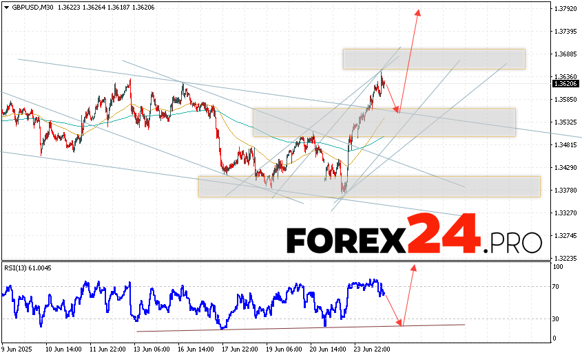 GBP/USD Forecast and Analysis for June 25, 2025 suggests an attempt to develop growth and test the support area near the 1.3545 level. Then, the quotes will continue to grow with a target near the 1.3795 level. An additional signal in favor of the British pound’s rise will be a test of the support line on the relative strength index (RSI). The growth scenario will be canceled if the British pound falls against the US dollar and breaks through the 1.3495 area. This will indicate a continuation of the decline in the Forex pair with a potential target below the 1.3325 level.