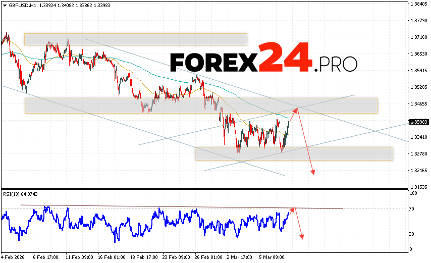 GBP/USD Forecast and Analysis for March 10, 2026 suggests an attempt to develop a bullish correction and test the resistance area near 1.3435. Then, a continued decline in quotes with a target near 1.3205. An additional signal for a decline in the British Pound would be a test of the resistance line on the relative strength indicator (RSI). A strong rise in the British Pound against the US Dollar and a breakout of 1.3585 would cancel the downward scenario. This would indicate a continued rise in the Forex pair with a potential target above 1.3885.