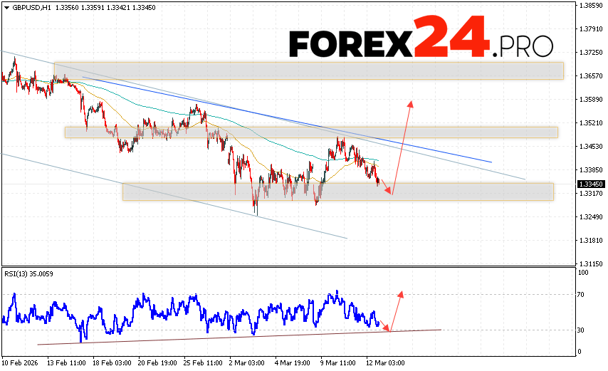 GBP/USD Forecast and Analysis for March 13, 2026 suggests an attempt to develop a bearish correction and test the support area near 1.3315. Subsequently, continued growth with a target near 1.3585. An additional signal in favor of an uptrend for the British Pound would be a test of the support line on the relative strength indicator (RSI). A decline in the British Pound against the US Dollar and a breakout of 1.3235 would cancel out this uptrend. This would indicate a continued decline in the Forex pair with a potential target below 1.3025.