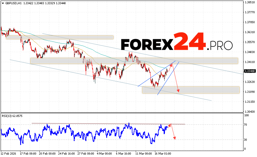 GBP/USD Forecast and Analysis for March 18, 2026 suggests an attempt to develop a bearish correction and test the resistance area near 1.3385. Subsequently, a continuation of the decline in quotes with a target near 1.3185. An additional signal favoring a decline in the British Pound would be a test of the resistance line on the relative strength indicator (RSI). A strong rise in the British Pound against the US Dollar and a breakout of 1.3495 would cancel the downward trend. This would indicate a continued rise in the Forex pair with a potential target above 1.3645.
