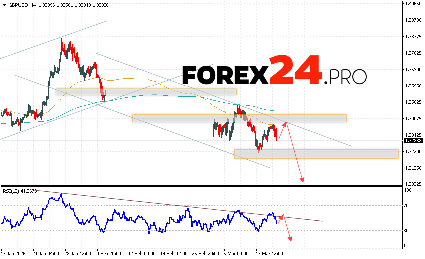GBP/USD Forecast and Analysis for March 19, 2026 suggests an attempt to develop a bearish correction and test the resistance area near 1.3375. Then, a continued decline in quotes with a target near 1.3055. An additional signal favoring a decline in the British Pound will be a test of the resistance line on the relative strength indicator (RSI). A strong rise in the British Pound against the US Dollar and a breakout of 1.3465 would cancel the downward scenario. This would indicate a continued rise in the Forex pair with a potential target above 1.3655.