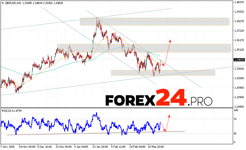 GBP/USD Forecast and Analysis for March 20, 2026 suggests an attempt to develop a bearish correction and test the support area near 1.3365. Then, continued growth with a target near 1.3615. An additional signal in favor of the British Pound’s rise would be a test of the support line on the relative strength indicator (RSI). A decline in the British Pound against the US Dollar and a breakout of 1.3185 would cancel out this upside scenario. This would indicate a continued decline in the Forex pair with a potential target below 1.2965.
