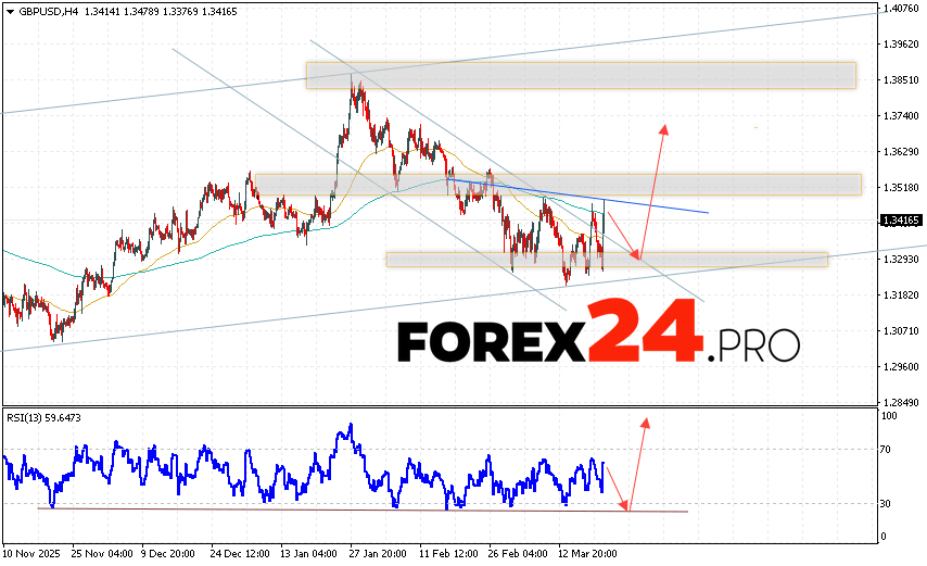 GBP/USD Forecast and Analysis for March 24, 2026 suggests an attempt to develop a bearish correction and test the support area near 1.3335. Then, continued growth with a target near 1.3655. An additional signal in favor of an uptrend for the British Pound will be a test of the support line on the relative strength indicator (RSI). A decline in the British Pound against the US Dollar and a breakout of 1.3175 would cancel out the uptrend. This would indicate a continued decline in the Forex pair with a potential target below 1.2955.