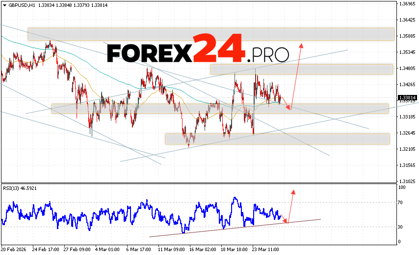 GBP/USD Forecast and Analysis for March 26, 2026 suggests an attempt to develop a bearish correction and test the support area near 1.3325. Then, continued growth with a target near 1.3565. An additional signal in favor of an uptrend for the British Pound would be a test of the support line on the relative strength indicator (RSI). A decline in the British Pound against the US Dollar and a breakout of 1.3245 would cancel out this uptrend. This would indicate continued decline in the Forex pair with a potential target below 1.2875.