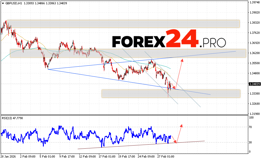 GBP/USD Forecast and Analysis for March 3, 2026 suggests an attempt to develop a bearish correction and test the support area near 1.3365. Subsequently, continued price growth with a target near 1.3575. An additional signal in favor of the British Pound’s rise would be a test of the support line on the relative strength indicator (RSI). The upside scenario would be cancelled if the British Pound falls against the US Dollar and breaks below 1.3285. This would indicate continued declines on the Forex pair, with a potential target below 1.3035.