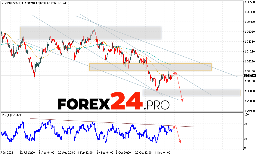 GBPUSD Forecast and Analysis for November 19, 2025 suggests an attempt to develop a bullish correction and test the resistance area near 1.3205. Subsequently, a continued decline with a target near 1.2865. An additional signal favoring a decline in the British Pound would be a test of the resistance line on the relative strength indicator (RSI). A strong rally in the British Pound against the US Dollar and a breakout of 1.3345 would cancel the downside scenario. This will indicate a continued rise in the Forex pair with a potential target above the level of 1.3485.