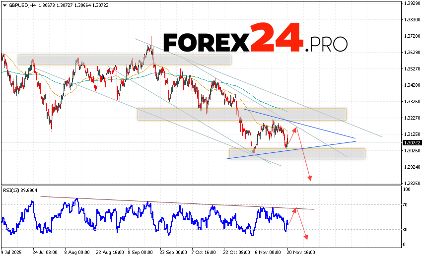 GBP/USD Forecast and Analysis for November 21, 2025 suggests an attempt to develop a bullish correction and test the resistance area near 1.3135. Then, continued decline in quotes with a target near 1.2825. An additional signal in favor of a decline in the British Pound would be a test of the resistance line on the relative strength indicator (RSI). A strong rally in the British Pound against the US Dollar and a breakout of 1.3245 would cancel out the downside scenario. This would indicate a continued rally in the Forex pair, with a potential target above 1.3475.