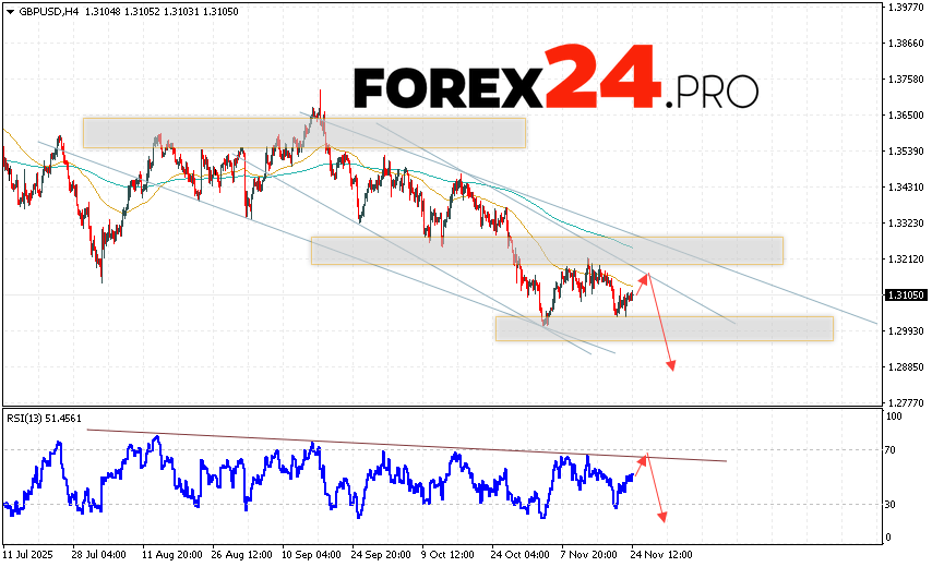 GBP/USD Forecast and Analysis for November 25, 2025 suggests an attempt to develop a bullish correction and a test of the resistance area near 1.3155. Then, a continued decline in quotes with a target near 1.2875 is expected. A test of the resistance line on the relative strength indicator (RSI) will be an additional signal for a decline in the British pound. A strong rise in the British pound against the US dollar and a breakout of 1.3245 will cancel out this downward trend. This will indicate a continued rally in the Forex pair with a potential target above 1.3475.