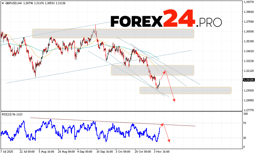 GBP/USD Forecast and Analysis for November 7, 2025 suggests an attempt to develop a bullish correction and test the resistance area near 1.3205. Then, continued declines with a target near 1.2875. An additional signal for a decline in the British Pound will be a test of the resistance line on the relative strength indicator (RSI). A strong rise in the British Pound against the US Dollar and a breakout of 1.3325 would cancel the downward trend. This would indicate a continued rise in the Forex pair with a potential target above 1.3485.