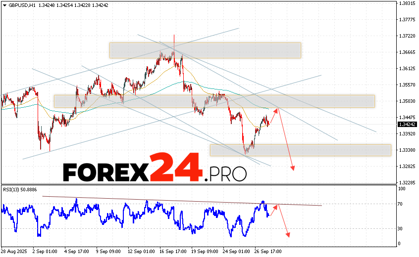 GBP/USD Forecast and Analysis for October 1, 2025 suggests an attempt to develop a bullish correction and test the resistance area near 1.3475. Subsequently, a further decline in quotes with a target near 1.3265. An additional signal in favor of a decline in the British Pound will be a test of the resistance line on the relative strength indicator (RSI). A strong rally in the British Pound against the US Dollar and a breakout of 1.3565 would cancel out the downside scenario. This would indicate a continued rally in the Forex pair, with a potential target above 1.3765.
