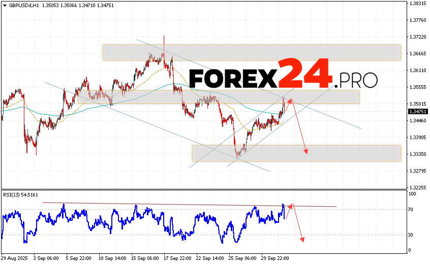 GBP/USD Forecast and Analysis for October 2, 2025 suggests an attempt to develop a bullish correction and test the resistance area near 1.3505. Then, continued declines with a target near 1.3335. An additional signal for a decline in the British Pound will be a test of the resistance line on the relative strength indicator (RSI). A strong rise in the British Pound against the US Dollar and a breakout of 1.3565 would cancel this downward scenario. This would indicate a continued rise in the Forex pair with a potential target above 1.3765.
