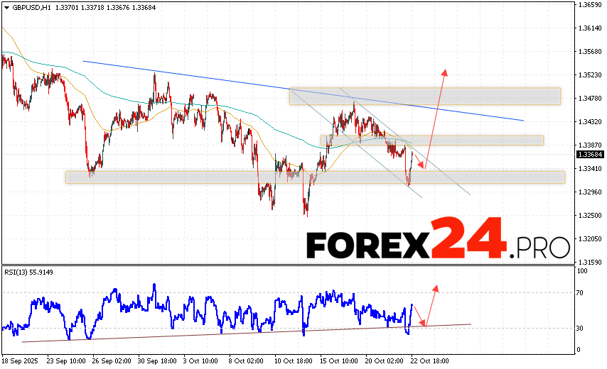 GBP/USD Forecast and Analysis for October 23, 2025 suggests an attempt at a bearish correction and a test of the support area near 1.3335. Subsequently, a continued rise in quotes with a target near 1.3525. An additional signal in favor of growth for the British Pound will be a test of the support line on the relative strength indicator (RSI). A decline in the British Pound against the US Dollar and a break of 1.3205 would cancel out this upward trend. This would indicate a continued decline in the Forex pair with a potential target below 1.3025.